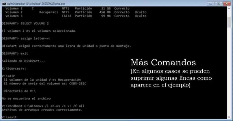 bcdboot C: \ Windows / l en-us / sx: / f ALL. (appuyez sur Entrée à chaque fois)